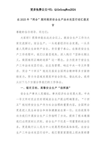 【七哥公文】2025年:在2025年“两会”期间做好安全生产治本攻坚行动汇报发言+更多免费公文+VX:QiGeGongWen2024+更多免费公文+VX:QiGeGongWen2024
