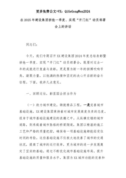 【七哥公文】2025年:在2025年建设集团拼抢一季度、实现“开门红”动员部署会上的讲话+更多免费公文+VX:QiGeGongWen2024+更多免费公文+VX:QiGeGongWen2024