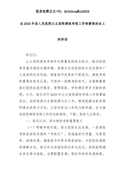 【七哥公文】2025年:在2025年县人民医院公立医院绩效考核工作部署推进会上的讲话+更多免费公文+VX:QiGeGongWen2024+更多免费公文+VX:QiGeGongWen2024