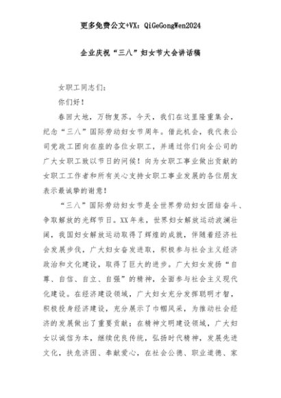 【七哥公文】2025年:企业庆祝“三八”妇女节大会讲话稿+更多免费公文+VX:QiGeGongWen2024+更多免费公文+VX:QiGeGongWen2024