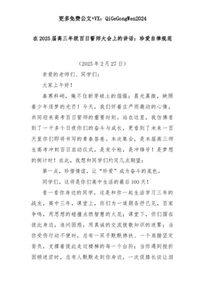【七哥公文】2025年:在2025届高三年级百日誓师大会上的讲话:珍爱自律规范+更多免费公文+VX:QiGeGongWen2024+更多免费公文+VX:QiGeGongWen2024