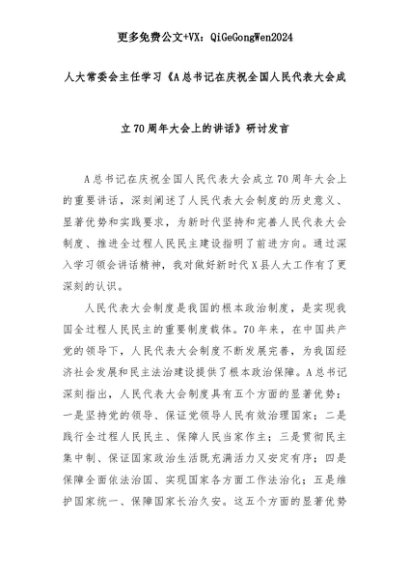 【七哥公文】2025年:人大常委会主任学习《A总书记在庆祝全国人民代表大会成立70周年大会上的讲话》研讨发言+更多免费公文+VX:QiGeGongWen2024+更多免费公文+VX:QiGeGongWen2024