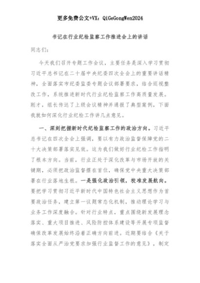【七哥公文】2025年:书记在行业纪检监察工作推进会上的讲话+更多免费公文+VX:QiGeGongWen2024+更多免费公文+VX:QiGeGongWen2024
