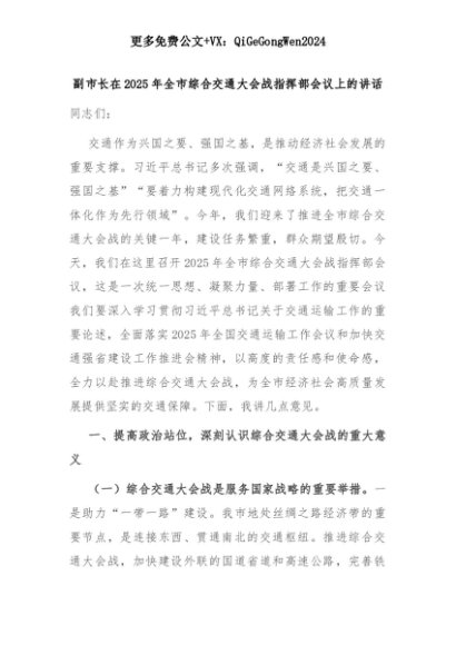 【七哥公文】2025年:副市长在2025年全市综合交通大会战指挥部会议上的讲话+更多免费公文+VX:QiGeGongWen2024+更多免费公文+VX:QiGeGongWen2024