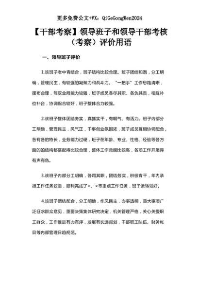 【七哥公文】2025年:【干部考察】领导班子和领导干部考核(考察)评价用语+更多免费公文+VX:QiGeGongWen2024+更多免费公文+VX:QiGeGongWen2024