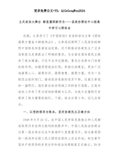 【七哥公文】2025年:立足政协大舞台 彰显履职新作为——县政协理论中心组集中学习心得体会+更多免费公文+VX:QiGeGongWen2024+更多免费公文+VX:QiGeGongWen2024