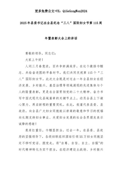【七哥公文】2025年:2025年县委书记在全县纪念“三八”国际妇女节第115周年暨表彰大会上的讲话+更多免费公文+VX:QiGeGongWen2024+更多免费公文+VX:QiGeGongWen2024