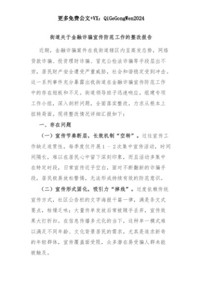 【七哥公文】2025年:街道关于金融诈骗宣传防范工作的整改报告+更多免费公文+VX:QiGeGongWen2024+更多免费公文+VX:QiGeGongWen2024