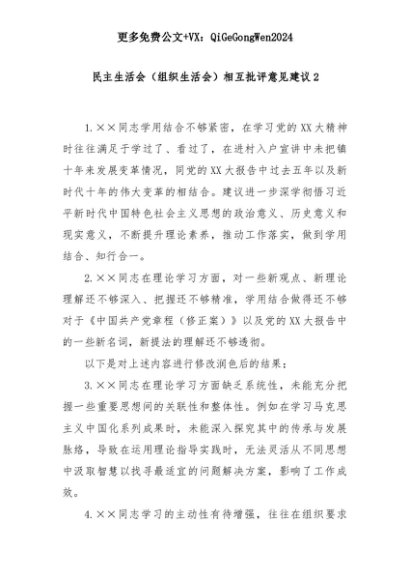【七哥公文】2025年:民主生活会(组织生活会)相互批评意见建议2+更多免费公文+VX:QiGeGongWen2024+更多免费公文+VX:QiGeGongWen2024