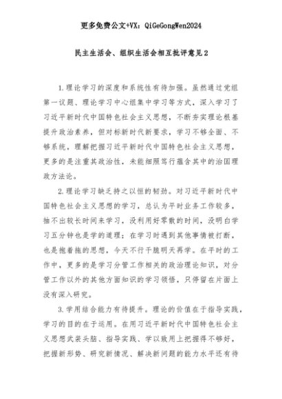 【七哥公文】2025年:民主生活会、组织生活会相互批评意见2+更多免费公文+VX:QiGeGongWen2024+更多免费公文+VX:QiGeGongWen2024