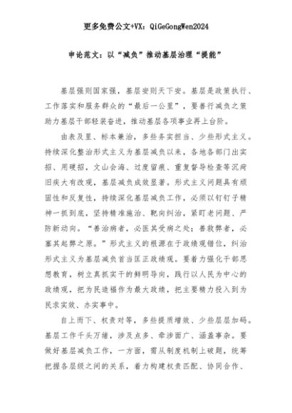 【七哥公文】2025年:申论范文:以“减负”推动基层治理“提能”+更多免费公文+VX:QiGeGongWen2024+更多免费公文+VX:QiGeGongWen2024