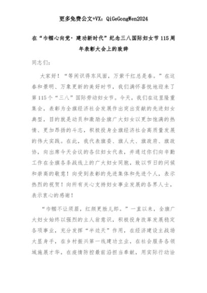 【七哥公文】2025年:在“巾帼心向党・建功新时代”纪念三八国际妇女节115周年表彰大会上的致辞+更多免费公文+VX:QiGeGongWen2024+更多免费公文+VX:QiGeGongWen2024