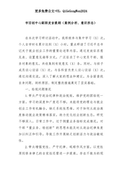 【七哥公文】2025年:市旧创中心副职发言提纲(案例分析、意识形态)+更多免费公文+VX:QiGeGongWen2024+更多免费公文+VX:QiGeGongWen2024