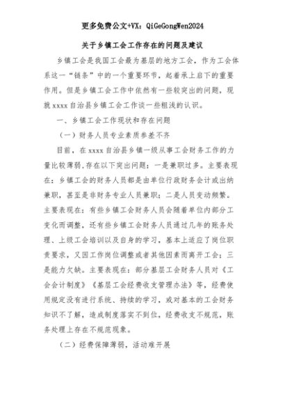 【七哥公文】2025年:关于乡镇工会工作存在的问题及建议+更多免费公文+VX:QiGeGongWen2024+更多免费公文+VX:QiGeGongWen2024
