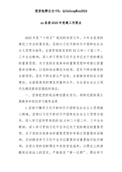 【七哥公文】2025年:xx县委2025年党建工作要点+更多免费公文+VX:QiGeGongWen2024+更多免费公文+VX:QiGeGongWen2024