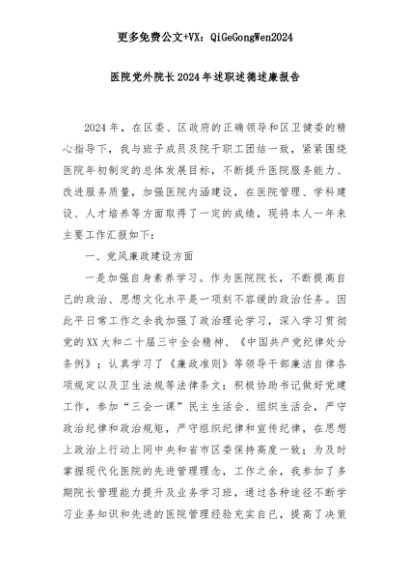【七哥公文】2025年:医院党外院长2024年述职述德述廉报告+更多免费公文+VX:QiGeGongWen2024+更多免费公文+VX:QiGeGongWen2024