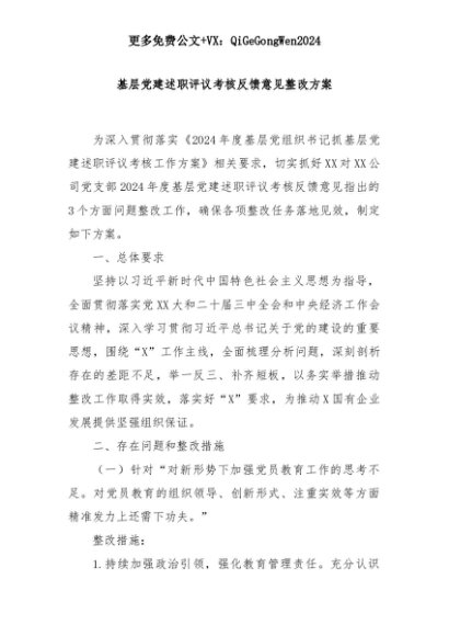 【七哥公文】2025年:基层党建述职评议考核反馈意见整改方案+更多免费公文+VX:QiGeGongWen2024+更多免费公文+VX:QiGeGongWen2024