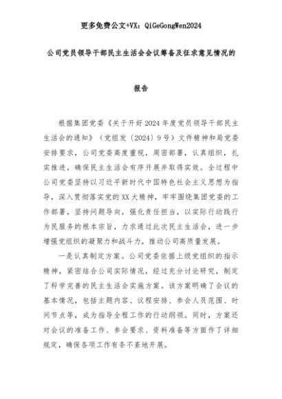 【七哥公文】2025年:公司党员领导干部民主生活会会议筹备及征求意见情况的报告+更多免费公文+VX:QiGeGongWen2024+更多免费公文+VX:QiGeGongWen2024
