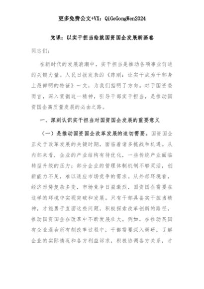 【七哥公文】2025年:党课:以实干担当绘就国资国企发展新画卷+更多免费公文+VX:QiGeGongWen2024+更多免费公文+VX:QiGeGongWen2024