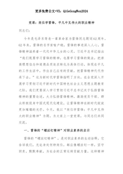 【七哥公文】2025年:党课:岗位学雷锋,平凡中见伟大的职业精神+更多免费公文+VX:QiGeGongWen2024+更多免费公文+VX:QiGeGongWen2024