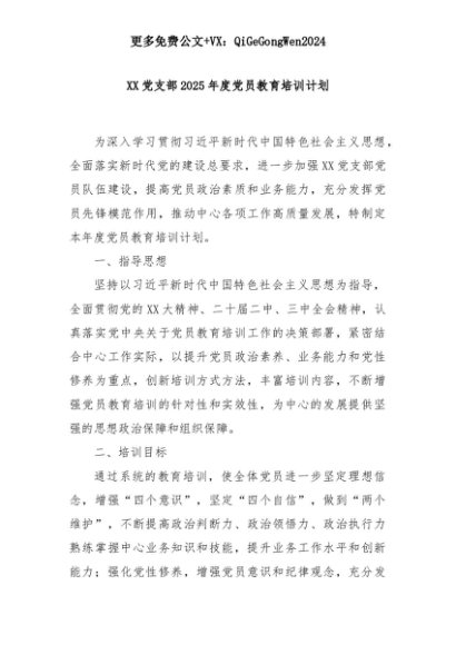 【七哥公文】2025年:XX党支部2025年度党员教育培训计划+更多免费公文+VX:QiGeGongWen2024+更多免费公文+VX:QiGeGongWen2024