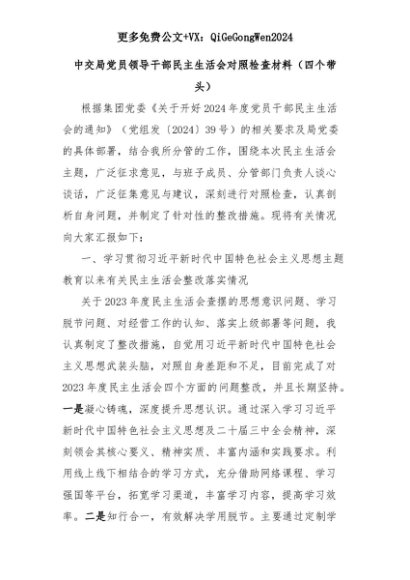 【七哥公文】2025年:中交局党员领导干部民主生活会对照检查材料(四个带头)+更多免费公文+VX:QiGeGongWen2024+更多免费公文+VX:QiGeGongWen2024
