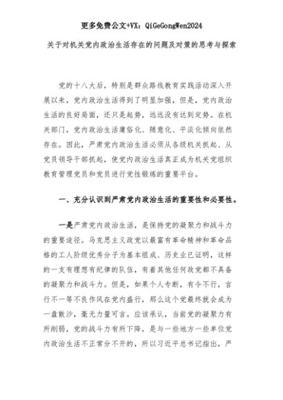 【七哥公文】2025年:关于对机关党内政治生活存在的问题及对策的思考与探索+更多免费公文+VX:QiGeGongWen2024+更多免费公文+VX:QiGeGongWen2024