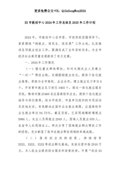 【七哥公文】2025年:XX市就创中心2024年工作总结及2025年工作计划+更多免费公文+VX:QiGeGongWen2024+更多免费公文+VX:QiGeGongWen2024
