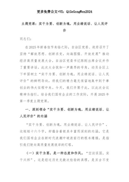 【七哥公文】2025年:主题党课:实干为要、创新为魂,用业绩说话、让人民评价+更多免费公文+VX:QiGeGongWen2024+更多免费公文+VX:QiGeGongWen2024