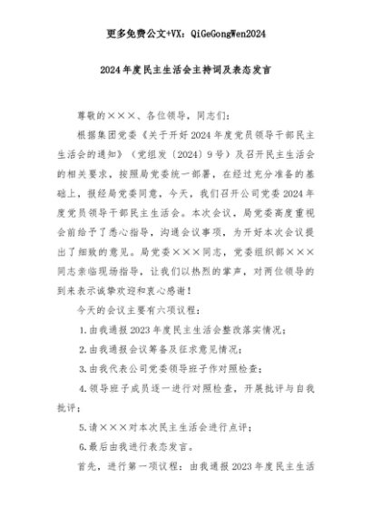 【七哥公文】2025年:2024年度民主生活会主持词及表态发言+更多免费公文+VX:QiGeGongWen2024+更多免费公文+VX:QiGeGongWen2024