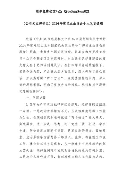 【七哥公文】2025年:(公司党支部书记)2024年度民主生活会个人发言提纲+更多免费公文+VX:QiGeGongWen2024+更多免费公文+VX:QiGeGongWen2024