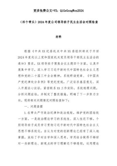 【七哥公文】2025年:(四个带头)2024年度公司领导班子民主生活会对照检查材料+更多免费公文+VX:QiGeGongWen2024+更多免费公文+VX:QiGeGongWen2024