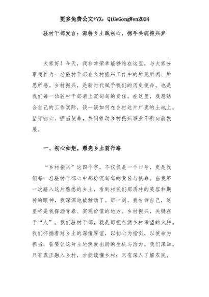 【七哥公文】2025年:驻村干部发言:深耕乡土践初心,携手共筑振兴梦+更多免费公文+VX:QiGeGongWen2024+更多免费公文+VX:QiGeGongWen2024