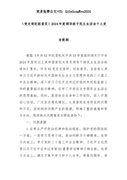 【七哥公文】2025年:(党支部纪组委员)2024年度领导班子民主生活会个人发言提纲+更多免费公文+VX:QiGeGongWen2024+更多免费公文+VX:QiGeGongWen2024