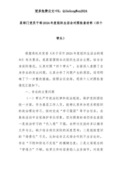 【七哥公文】2025年:某部门党员干部2024年度组织生活会对照检查材料(四个带头)+更多免费公文+VX:QiGeGongWen2024+更多免费公文+VX:QiGeGongWen2024