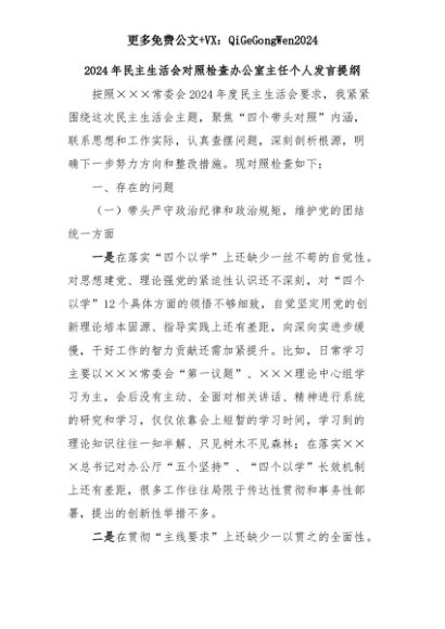 【七哥公文】2025年:2024年民主生活会对照检查办公室主任个人发言提纲+更多免费公文+VX:QiGeGongWen2024+更多免费公文+VX:QiGeGongWen2024