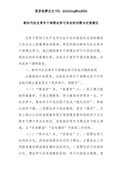 【七哥公文】2025年:新时代机关青年干部理论学习存在的问题与对策建议+更多免费公文+VX:QiGeGongWen2024+更多免费公文+VX:QiGeGongWen2024