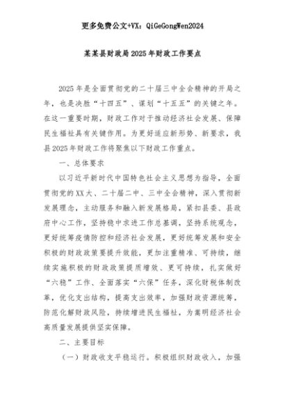 【七哥公文】2025年:某某县财政局2025年财政工作要点+更多免费公文+VX:QiGeGongWen2024+更多免费公文+VX:QiGeGongWen2024