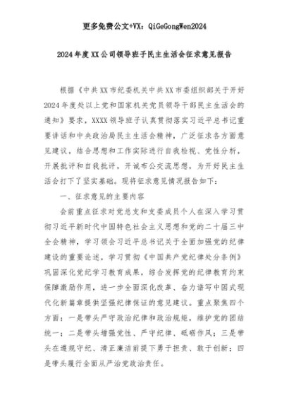 【七哥公文】2025年:2024年度XX公司领导班子民主生活会征求意见报告+更多免费公文+VX:QiGeGongWen2024+更多免费公文+VX:QiGeGongWen2024