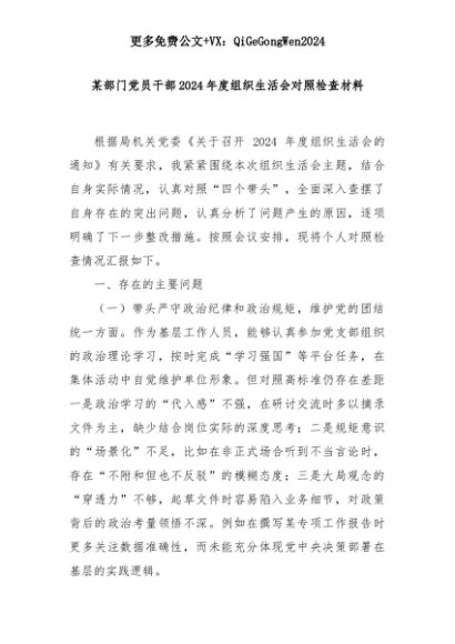 【七哥公文】2025年:某部门党员干部2024年度组织生活会对照检查材料+更多免费公文+VX:QiGeGongWen2024+更多免费公文+VX:QiGeGongWen2024