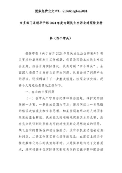 【七哥公文】2025年:市直部门某领导干部2024年度专题民主生活会对照检查材料(四个带头)+更多免费公文+VX:QiGeGongWen2024+更多免费公文+VX:QiGeGongWen2024