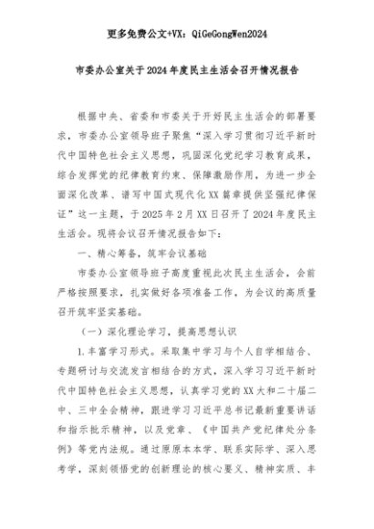 【七哥公文】2025年:市委办公室关于2024年度民主生活会召开情况报告+更多免费公文+VX:QiGeGongWen2024+更多免费公文+VX:QiGeGongWen2024