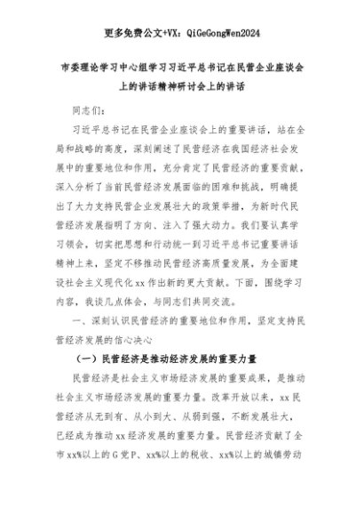 【七哥公文】2025年:市委理论学习中心组学习习近平总书记在民营企业座谈会上的讲话精神研讨会上的讲话+更多免费公文+VX:QiGeGongWen2024+更多免费公文+VX:QiGeGongWen2024