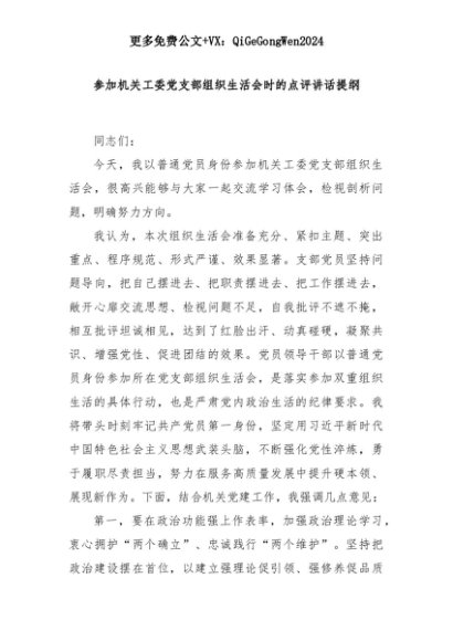 【七哥公文】2025年:参加机关工委党支部组织生活会时的点评讲话提纲+更多免费公文+VX:QiGeGongWen2024+更多免费公文+VX:QiGeGongWen2024
