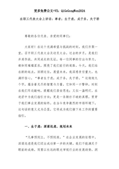 【七哥公文】2025年:在职工代表大会上讲话:事者;生于虑,成于务,失于骄+更多免费公文+VX:QiGeGongWen2024+更多免费公文+VX:QiGeGongWen2024