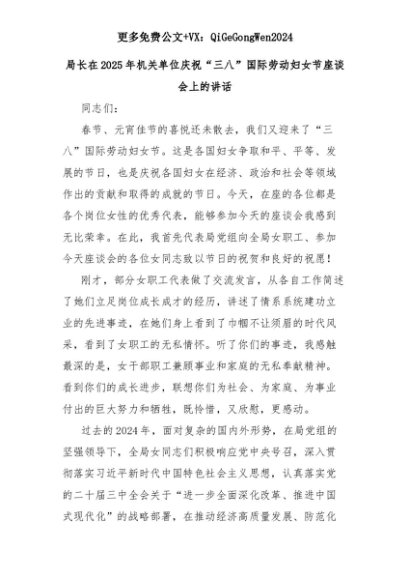 【七哥公文】2025年:局长在2025年机关单位庆祝“三八”国际劳动妇女节座谈会上的讲话+更多免费公文+VX:QiGeGongWen2024+更多免费公文+VX:QiGeGongWen2024