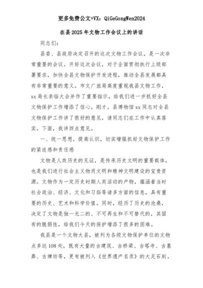 【七哥公文】2025年:在县2025年文物工作会议上的讲话+更多免费公文+VX:QiGeGongWen2024+更多免费公文+VX:QiGeGongWen2024