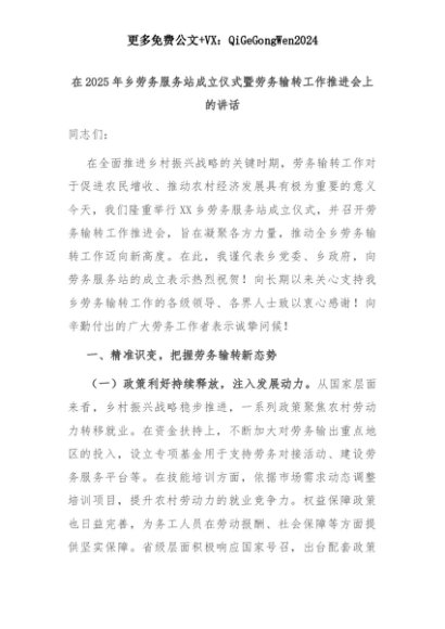 【七哥公文】2025年:在2025年乡劳务服务站成立仪式暨劳务输转工作推进会上的讲话+更多免费公文+VX:QiGeGongWen2024+更多免费公文+VX:QiGeGongWen2024