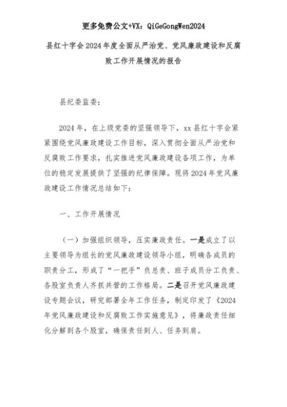 【七哥公文】2025年:县红十字会2024年度全面从严治党、党风廉政建设和反腐败工作开展情况的报告+更多免费公文+VX:QiGeGongWen2024+更多免费公文+VX:QiGeGongWen2024