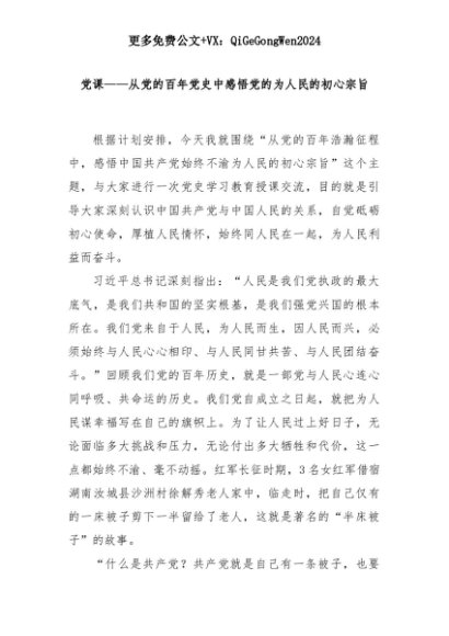 【七哥公文】2025年:党课——从党的百年党史中感悟党的为人民的初心宗旨+更多免费公文+VX:QiGeGongWen2024+更多免费公文+VX:QiGeGongWen2024